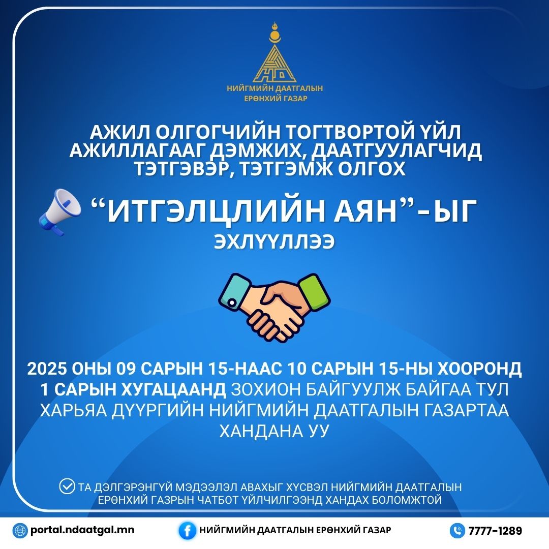 Нийгмийн даатгалын ерөнхий газраас шимтгэл төлөгч аж ахуйн нэгж, байгууллагын тогтвортой үйл ажиллагааг дэмжих, даатгуулагчид тэтгэвэр, тэтгэмж тогтоож олгоход хамтран ажиллах зорилго бүхий “Итгэлцлийн аян”-ыг 2025 оны 09 сарын 15-наас 10 сарын 15-ны хооронд 1 сарын хугацаанд зохион байгуулж байна.