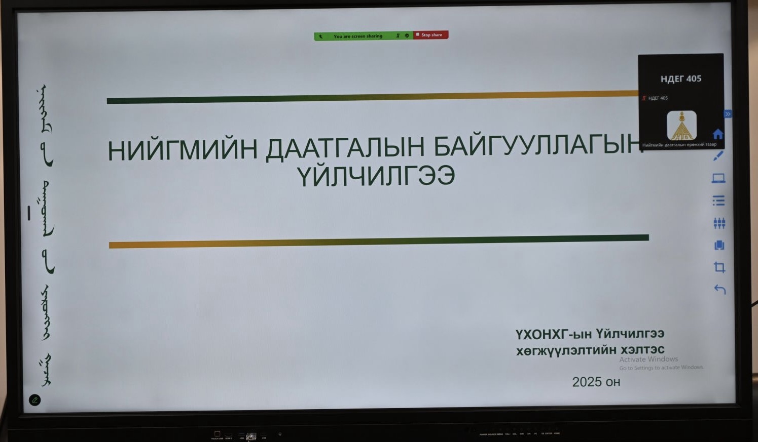 Нийгмийн даатгалын албан хаагчдыг чадавхжуулах ажлын хүрээнд нийгмийн даатгалын хууль тогтоомжийн талаар Бүгд найрамдах Солонгос улсын Хөдөлмөр нийгмийн хамгааллын үйлчилгээний төвийн албан хаагчдад 2025 оны 10 дугаар сарын  21-ны өдөр цахимаар сургалт зохион байгуулж, сургалтыг Үйлчилгээ хөгжүүлэлт, олон нийттэй харилцах газрын Үйлчилгээ хөгжүүлэлтийн хэлтсийн дарга М.Гэрэлмаа  орж, Сургалт хариуцсан мэргэжилтэн Б.Цэрэнчимэд зохион байгууллаа.