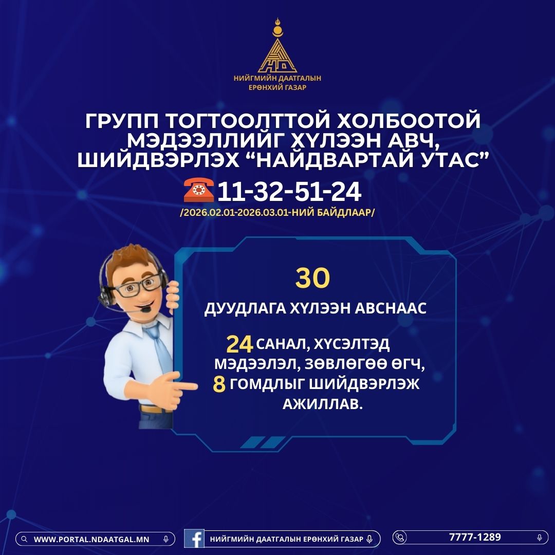 Иргэд та бүхэн групп тогтоолттой холбоотой асуудлаар мэдээлэл авах болон санал гомдол гаргах бол 11-32-51-24 дугаарын утсаар холбогдоно уу.