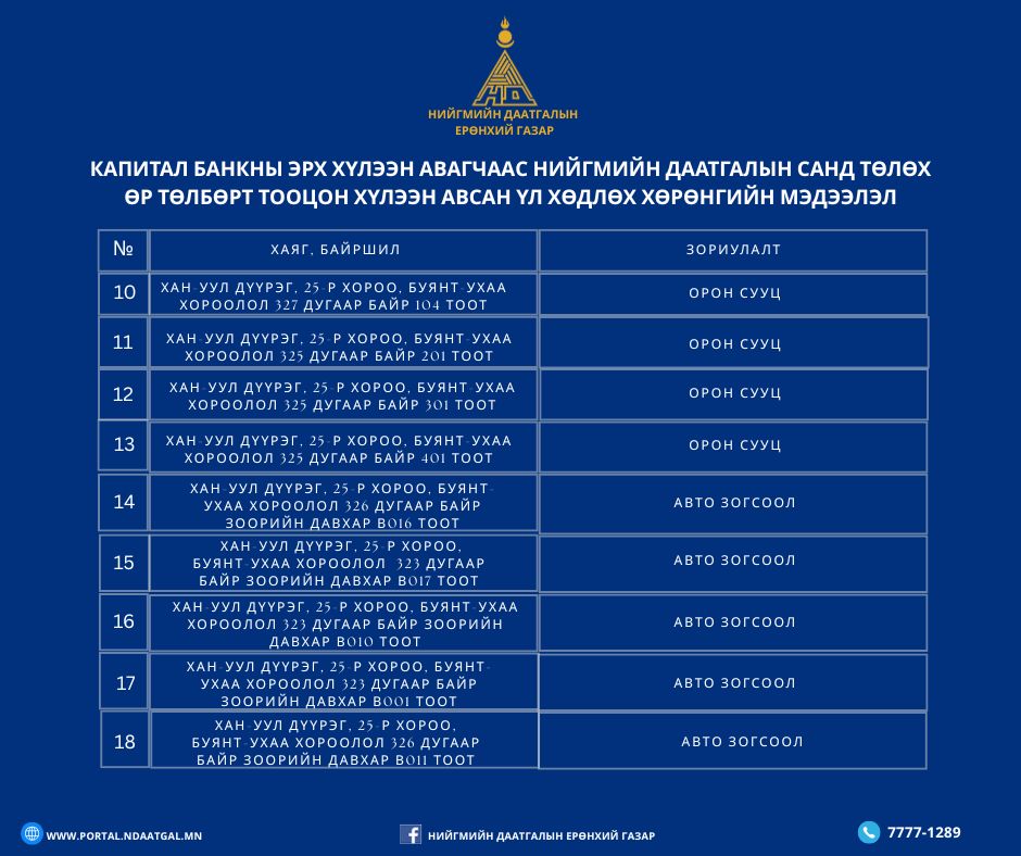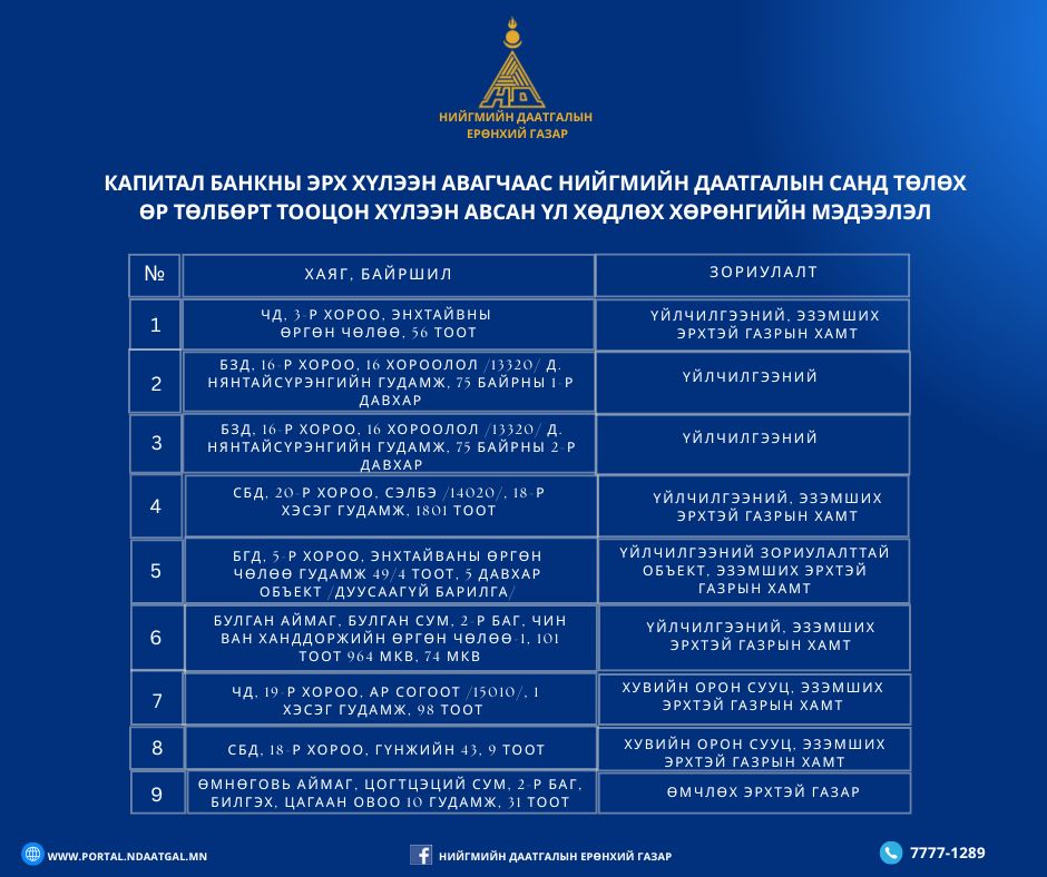 Капитал банкны нийгмийн даатгалын санд төлөгдөх өр төлбөрт тооцон авсан 18 байршилд байгаа 25 ширхэг үл хөдлөх хөрөнгийн жагсаалтыг та бүхэнд ил тод, нээлттэйгээр танилцуулж байна.