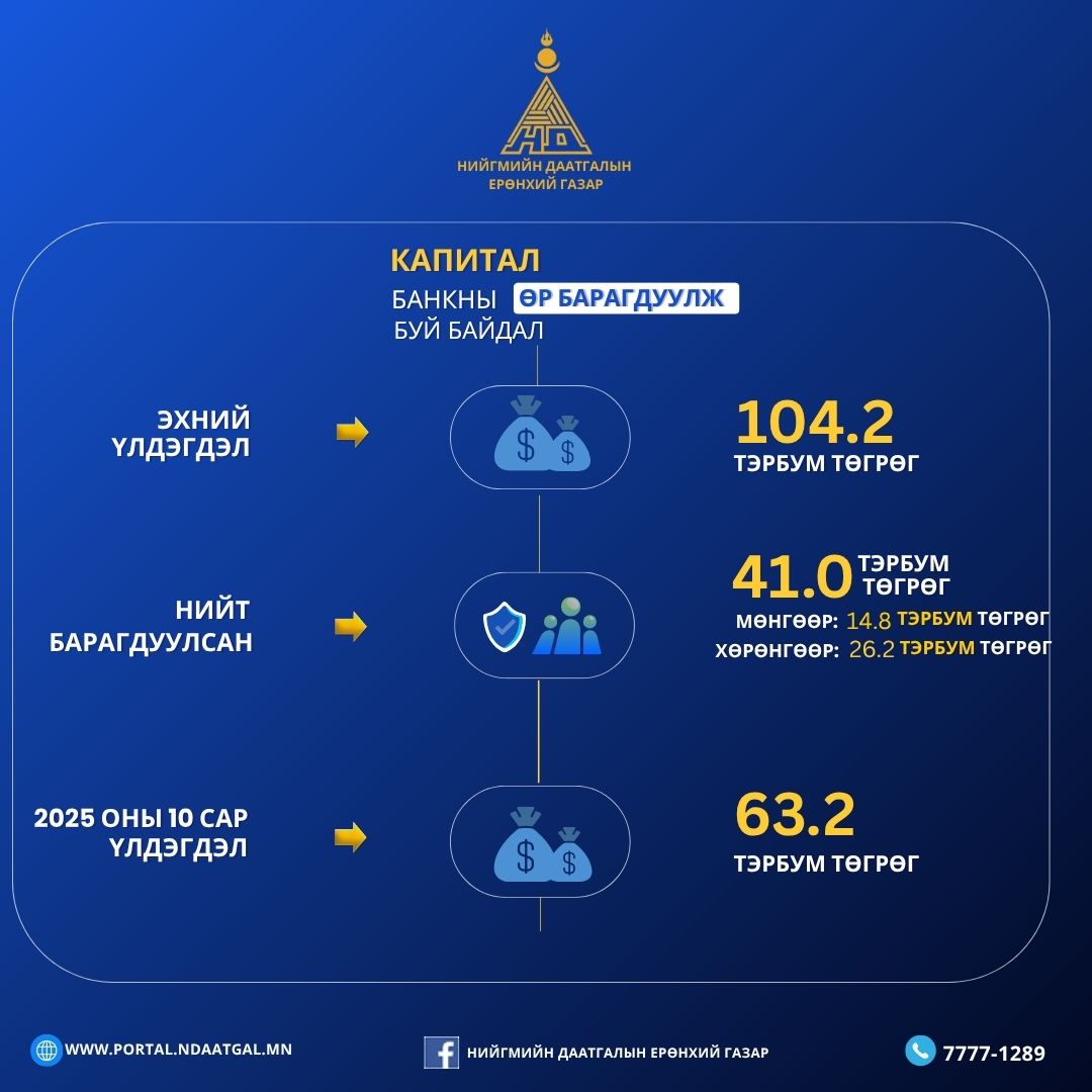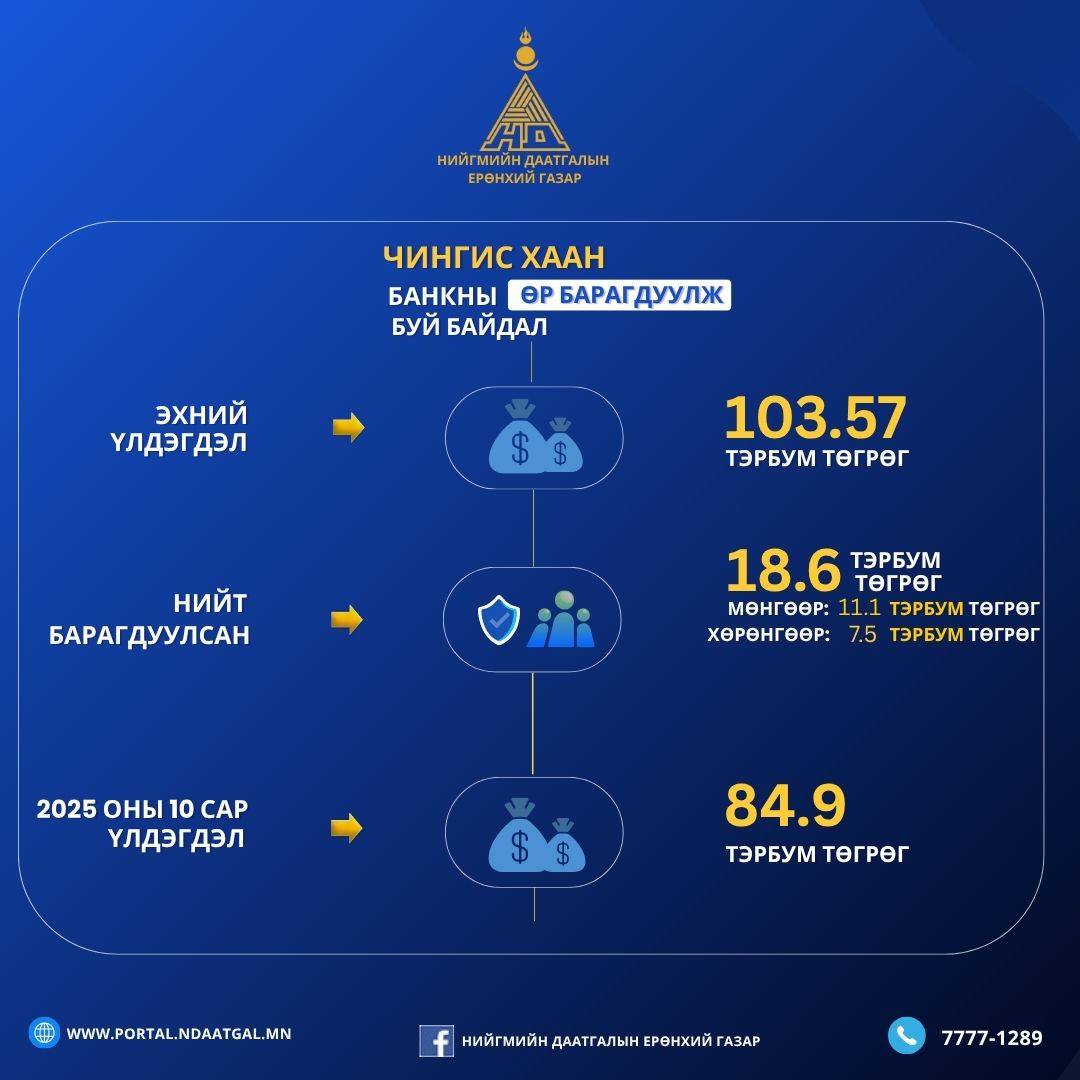 Нийгмийн даатгалын байгууллага Капитал банк болон Чингис хаан банкны нийгмийн даатгалын санд төлөх өр төлбөрийг төлүүлэх ажлыг тасралтгүй зохион байгуулж байна. Энэ ажлын үр дүнд 2025 оны 10 дугаар сарын байдлаар нийт 59.6 тэрбум төгрөгийг төлүүлээд байна.