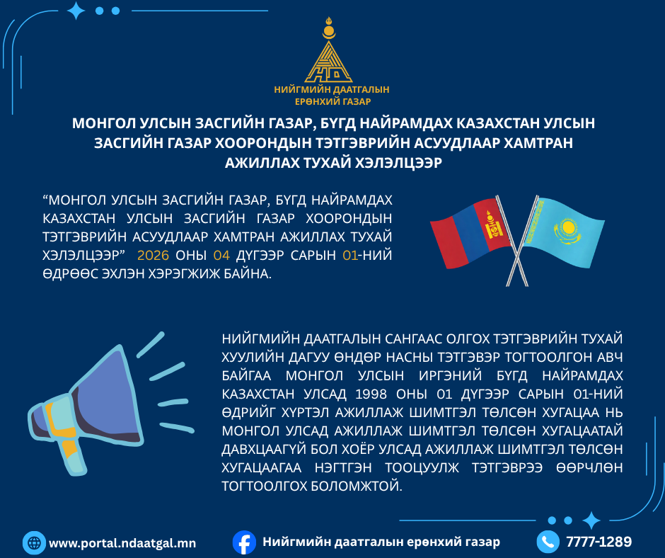 НүүрМэдээМОНГОЛ УЛСЫН ЗАСГИЙН ГАЗАР, БҮГД НАЙРАМДАХ КАЗАХСТАН УЛСЫН ЗАСГИЙН ГАЗАР ХООРОНДЫН ТЭТГЭВРИЙН АСУУДЛААР ХАМТРАН АЖИЛЛАХ ТУХАЙ ХЭЛЭЛЦЭЭР АЛБАН ЁСООР ХЭРЭГЖИЖ ЭХЭЛЛЭЭМОНГОЛ УЛСЫН ЗАСГИЙН ГАЗАР, БҮГД НАЙРАМДАХ КАЗАХСТАН УЛСЫН ЗАСГИЙН ГАЗАР ХООРОНДЫН ТЭТГЭВРИЙН АСУУДЛААР ХАМТРАН АЖИЛЛАХ ТУХАЙ ХЭЛЭЛЦЭЭР АЛБАН ЁСООР ХЭРЭГЖИЖ ЭХЭЛЛЭЭ2026.04.02 Бусдад түгээхХуваалцахЖиргэх