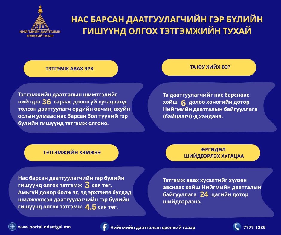 НүүрМэдээНАС БАРСАН ДААТГУУЛАГЧИЙН ГЭР БҮЛИЙН ГИШҮҮНД ОЛГОХ ТЭТГЭМЖИЙН ТУХАЙНАС БАРСАН ДААТГУУЛАГЧИЙН ГЭР БҮЛИЙН ГИШҮҮНД ОЛГОХ ТЭТГЭМЖИЙН ТУХАЙ2026.03.12 НАС БАРСАН ДААТГУУЛАГЧИЙН ГЭР БҮЛИЙН ГИШҮҮНД ОЛГОХ ТЭТГЭМЖИЙН ТУХАЙ Бусдад түгээхХуваалцахЖиргэх