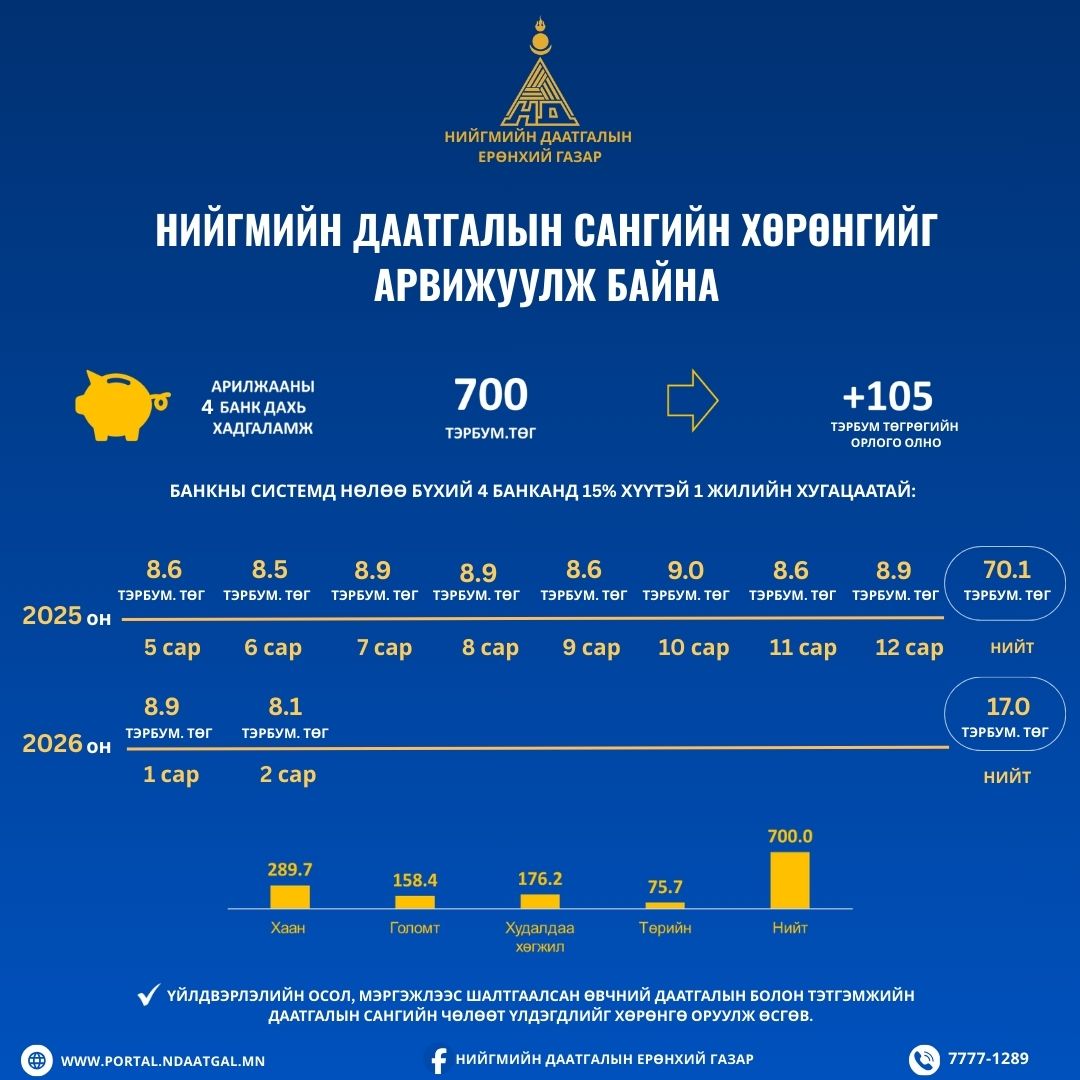 Нийгмийн даатгалын ерөнхий газар арилжааны банканд мөнгөн хадгаламж байршуулах хөрөнгийн тооцооллыг хийж Нийгмийн даатгалын үндэсний зөвлөлийн дэргэдэх орон тооны бус Мэргэжлийн хороо, Олон нийтийн хяналтын зөвлөлөөр хянуулж, 2025 оны 05 дугаар сарын 02-ны өдөр банкны системд нөлөө бүхий арилжааны 4 банканд нийгмийн даатгалын сангийн чөлөөт үлдэгдэл болох 700.0 тэрбум төгрөгийг мөнгөн хадгаламж хэлбэрээр хуваан байршуулсан.