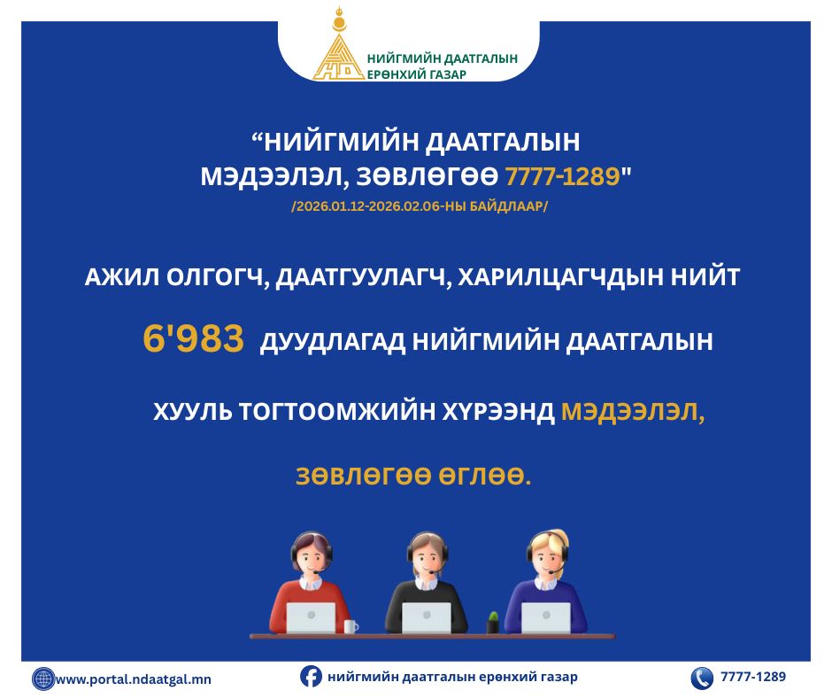 Нийгмийн даатгалын ерөнхий газар нь нийт 6983 дуудлагад нийгмийн даатгалын хууль тогтоомжийн мэдээлэл, зөвлөгөө өглөө.