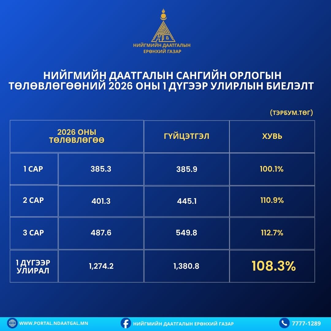 Энэхүү төлөвлөгөөний хэрэгжилтийн хүрээнд 2026 оны нэгдүгээр улирлын байдлаар орлогын төлөвлөгөө 108.3 хувийн гүйцэтгэлтэй биелж, төлөвлөсөн хэмжээнээс давсан үзүүлэлттэй гарлаа. Энэ нь нийгмийн даатгалын тогтолцооны санхүүгийн тогтвортой байдлыг хангах, иргэдэд үзүүлэх үйлчилгээний тасралтгүй байдлыг баталгаажуулахад чухал үр дүн болж байна.