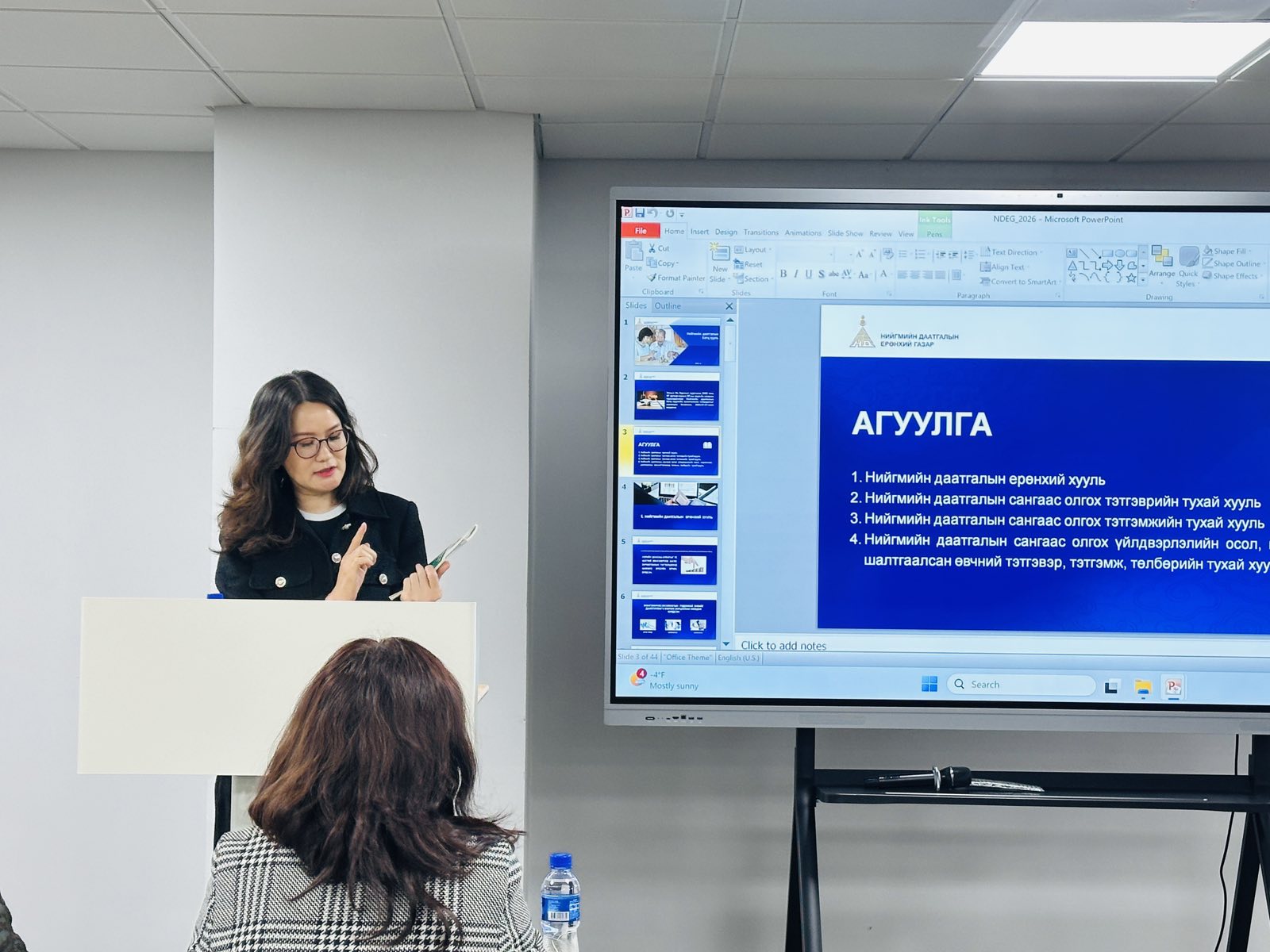 Нийгмийн даатгалын ерөнхий газар, Нийслэлийн аялал зуучлалын газартай хамтран 2026 оны 02 дугаар сарын 10-ны өдөр Жуулчны бааз болон Тур операторын бизнес эрхлэгч нарт зориулан “Нийгмийн даатгалын багц хууль”, “Нийгмийн даатгалын шимтгэл”, “Улирлын гэрээт ажилтны НДШ хэрхэн тооцох, тайлагнах”, “Ажил олгогч, даатгуулагчийн эрх, үүрэг, анхаарах асуудлууд” сэдвийн хүрээнд НДЕГ-ын сургагч багш Ч.Сансарчимэг, Хяналт шалгалтын ахлах байцаагч Э.Азмаа нар хүргэж, оролцогчдын асуултад хариулт өгч ажиллалаа.