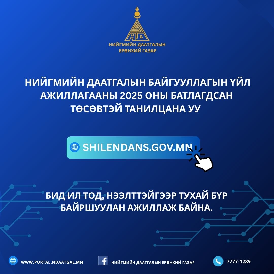 НүүрМэдээТа Нийгмийн даатгалын байгууллагын үйл ажиллагааны 2025 оны батлагдсан төсөвтэй танилцана ууТа Нийгмийн даатгалын байгууллагын үйл ажиллагааны 2025 оны батлагдсан төсөвтэй танилцана уу2025.07.23 Нийгмийн даатгалын байгууллагын үйл ажиллагааны 2025 оны батлагдсан төсөвтэй танилцана уу 👉Нийгмийн даатгалын ерөнхий газар Бусдад түгээхХуваалцахЖиргэх