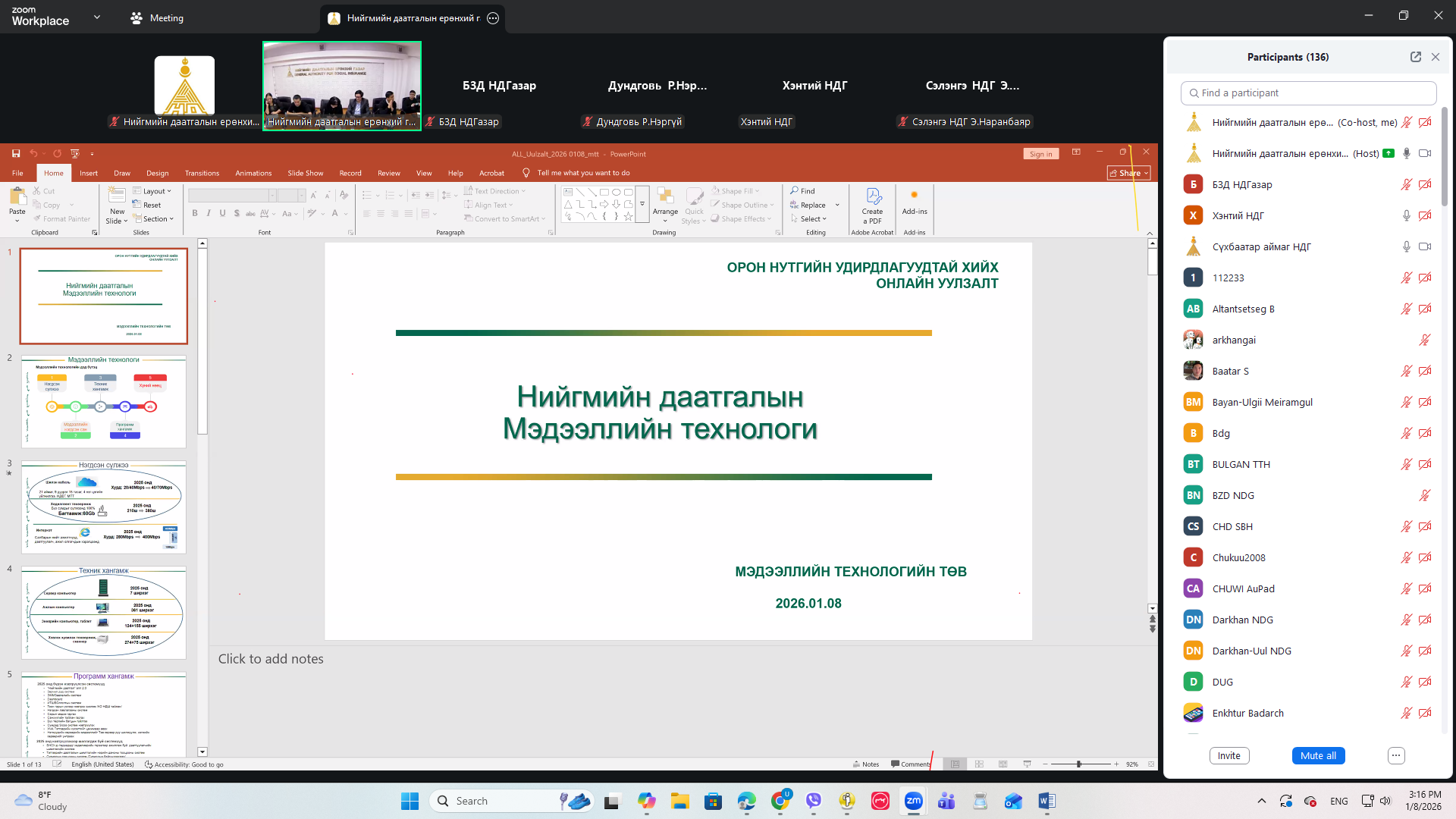 Нийгмийн даатгалын ерөнхий газрын дэргэдэх мэдээллийн технологийн төвөөс 2025 онд хийж хэрэгжүүлсэн ажлын үр дүн, 2026 онд хэрэгжүүлэх ажлын зорилго, цахимжилттай холбоотой анхаарах асуудлын талаар цахимаар 21 аймаг, 9 дүүргийн нийгмийн даатгалын газрын албан хаагчдад мэдээлэл өглөө.