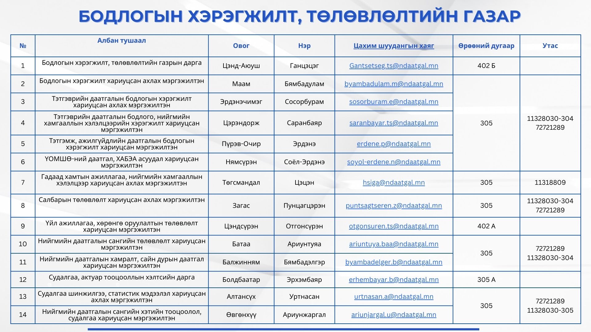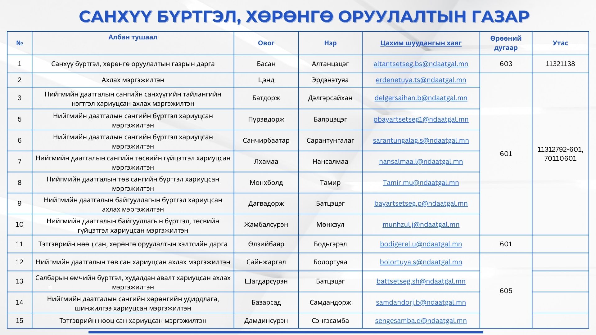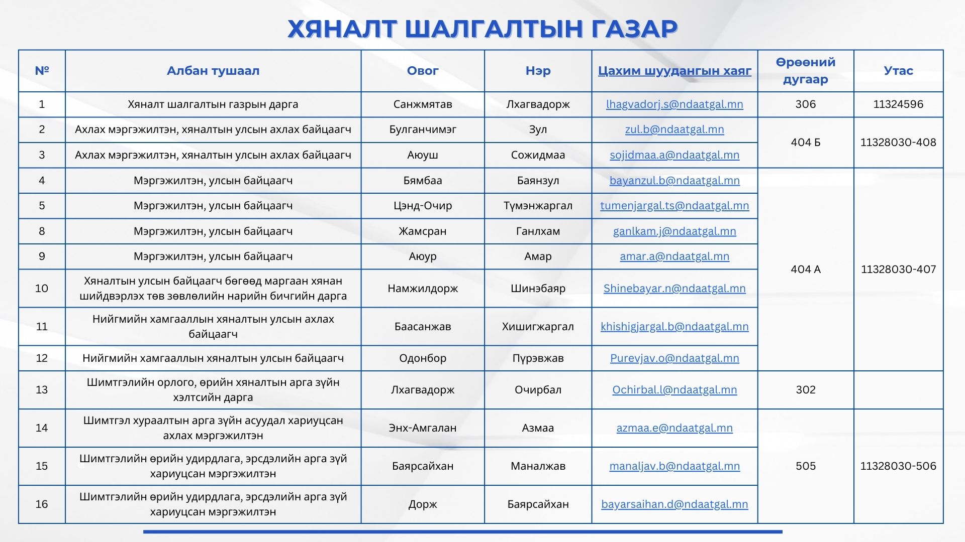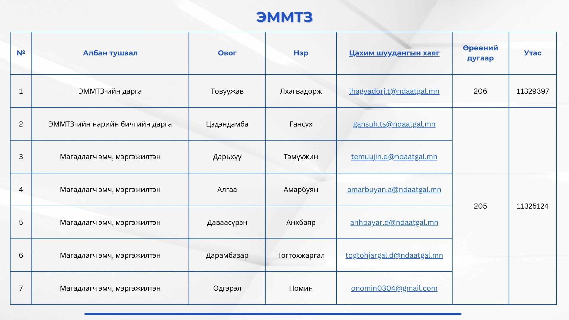 МЭДЭЭЛЭЛ ХАРИУЦАГЧ: ЗУГ-ХҮНИЙ НӨӨЦИЙН МЭРГЭЖИЛТЭН Б. ЭРДЭНЭЧИМЭГ, ХОЛБОГДОХ УТАСНЫ ДУГААР: 99074906